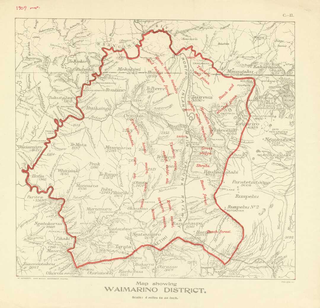 Cheap nature mapped: this 1909 survey of the Waimarino District shows the stands of native forest within reach of the main trunk line. Alexander Turnbull Library.
